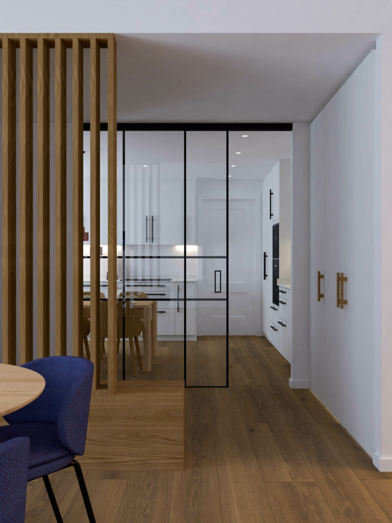 La vivienda consta de una planta principal donde ubicamos el grueso de las estancias, conviviendo en la misma planta la zona de día y de noche. Nos encontramos con tres dormitorios. Uno de ellos, el principal, con acceso a un baño privado completo. El otro baño, también completo, con acceso desde las zonas comunes. El corazón de la vivienda es la zona de día; espacio en el que nos encontramos los elementos más llamativos del proyecto. Partiendo desde la entrada, delimitada por un tabique de celosía cerámica que permite el paso de luz al comedor a la par que proporciona cierta intimidad al mismo; desde este acceso nos encontraremos a mano izquierda la cocina, independizada del resto del espacio mediante un gran cerramiento de madera y vidrio rayado que, una vez más, nos permite el paso de luz pero nos aísla visualmente en caso de necesitarlo.