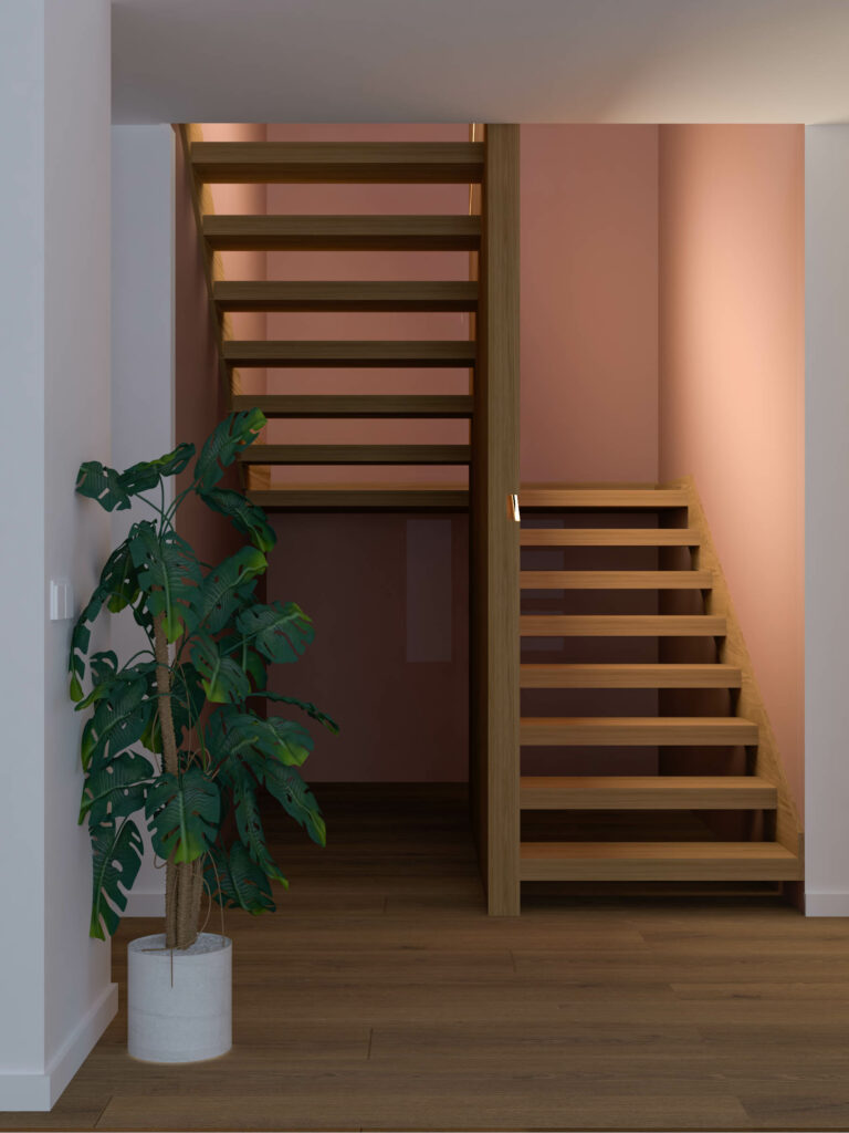 Otro elemento de gran protagonismo es la escalera; el primer escalón se extiende abarcando la totalidad del hueco y caprichosamente, tanto este escalón como los dos siguientes, son diferentes al resto en forma y acabado; confiriéndole al diseño un aire divertido.