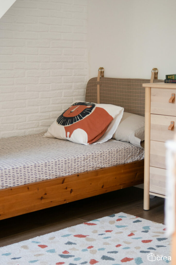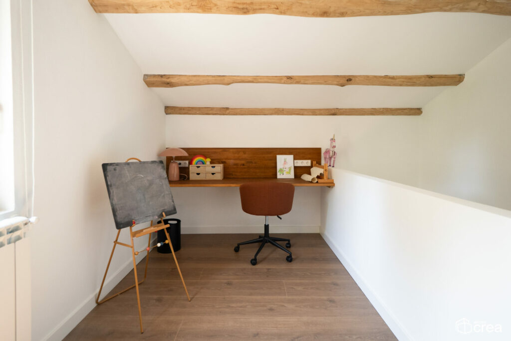 Ubicada en la parte original de la vivienda, esta habitación infantil se desarrolla en dos niveles, aprovechando la conexión que ya existía entre estas dos plantas. La planta baja acoge la zona de descanso, mientras que el altillo, accesible desde la propia estancia, se transforma en un rincón de estudio y juegos.