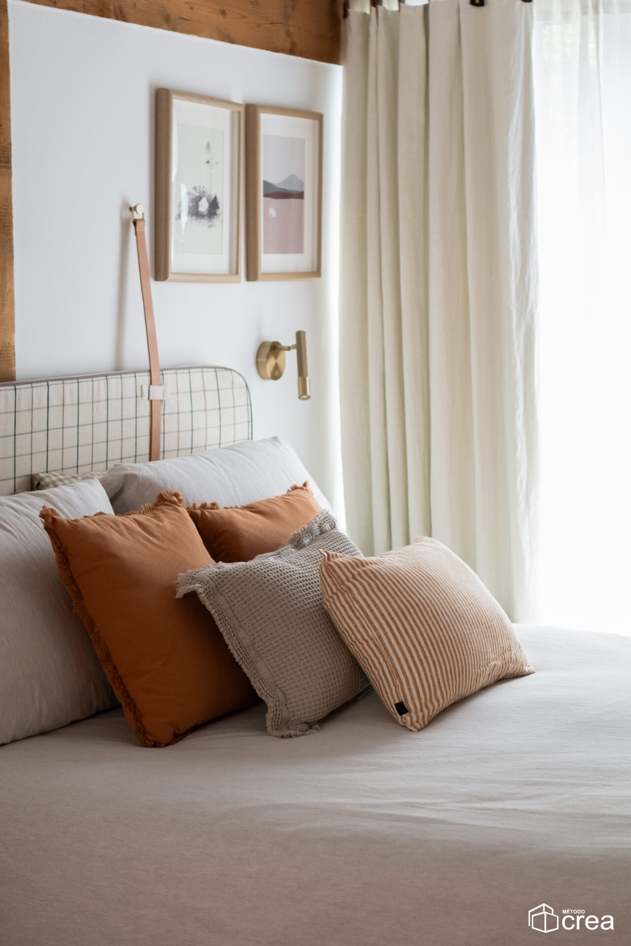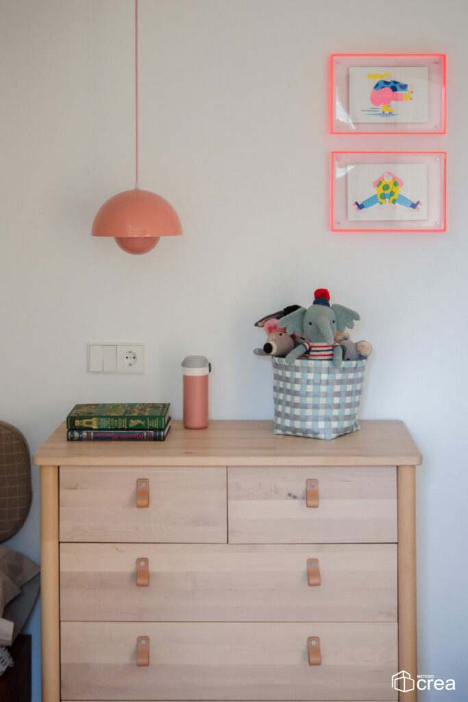 El dormitorio mantiene el carácter acogedor con una paleta suave que acompaña el conjunto, en la que destacan pequeñas notas de color (rosas, azules y flúor) que dialogan con los acentos cromáticos del resto de la vivienda, creando una continuidad visual entre estancias.
