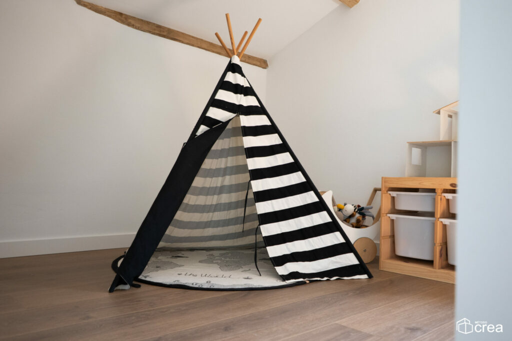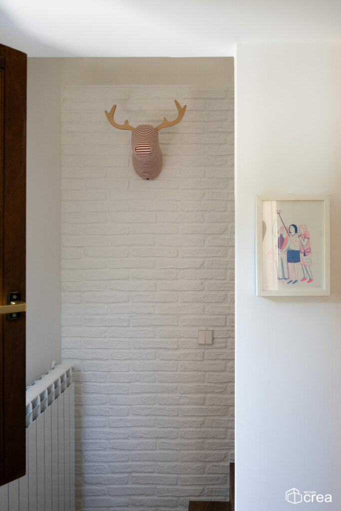 En la parte superior, el espacio se convierte en un estudio lúdico pensado para acompañar el crecimiento. La mesa de trabajo integrada aprovecha la inclinación de la cubierta, reforzada con vigas vistas de madera que aportan calidez y conexión con el resto de la arquitectura. Detalles decorativos como ilustraciones, estanterías abiertas con libros y juguetes cuidadosamente seleccionados aportan personalidad y estimulan la creatividad.