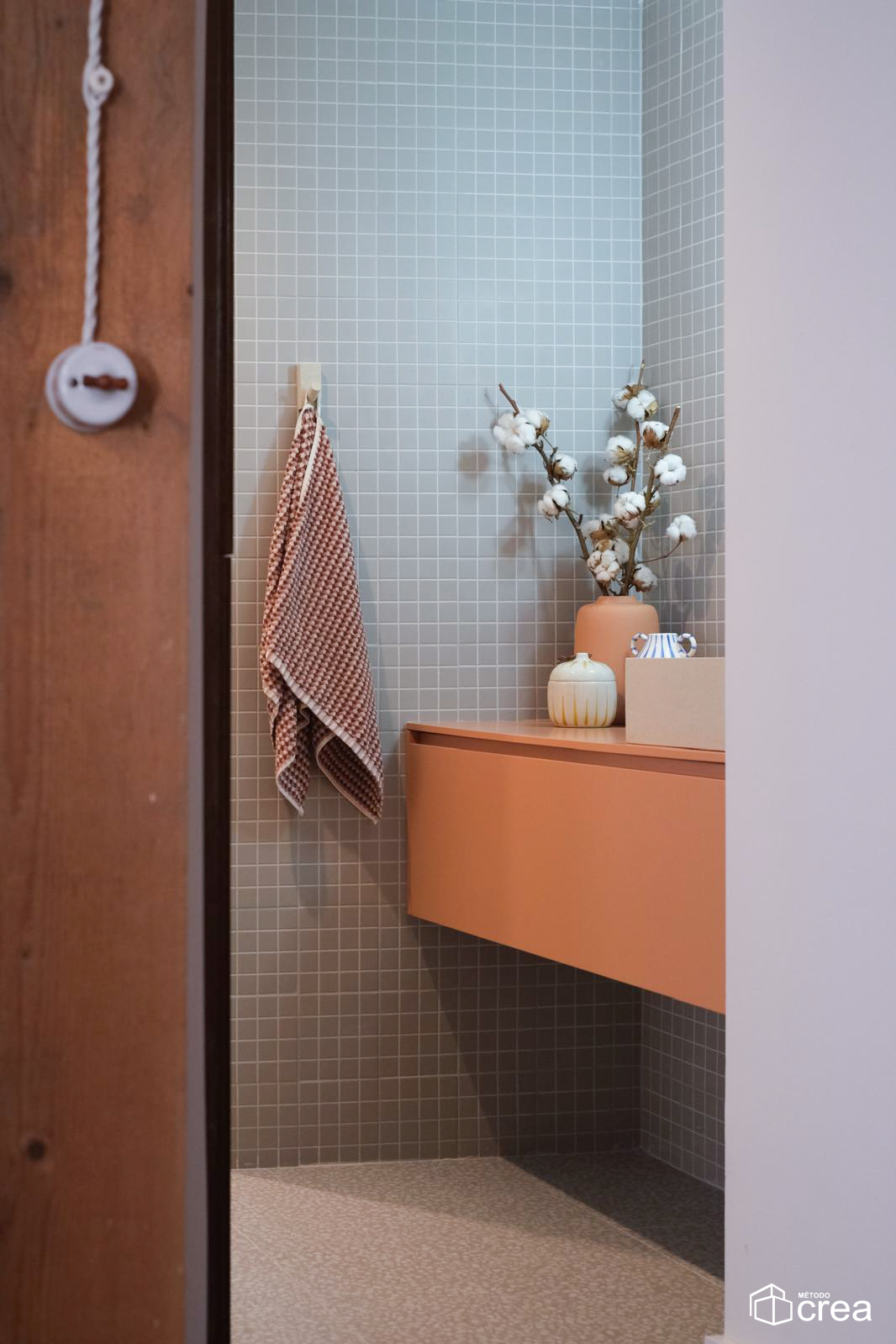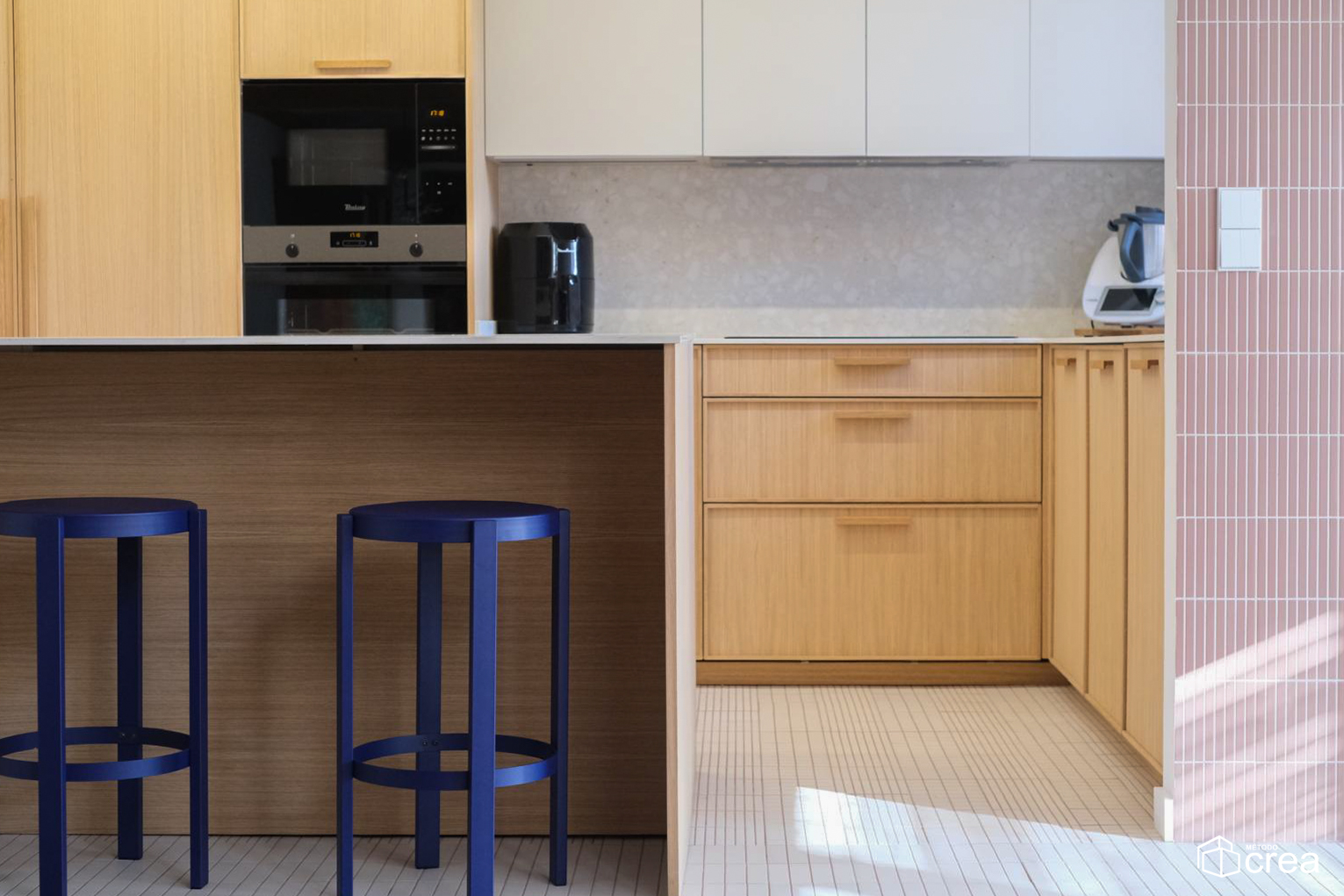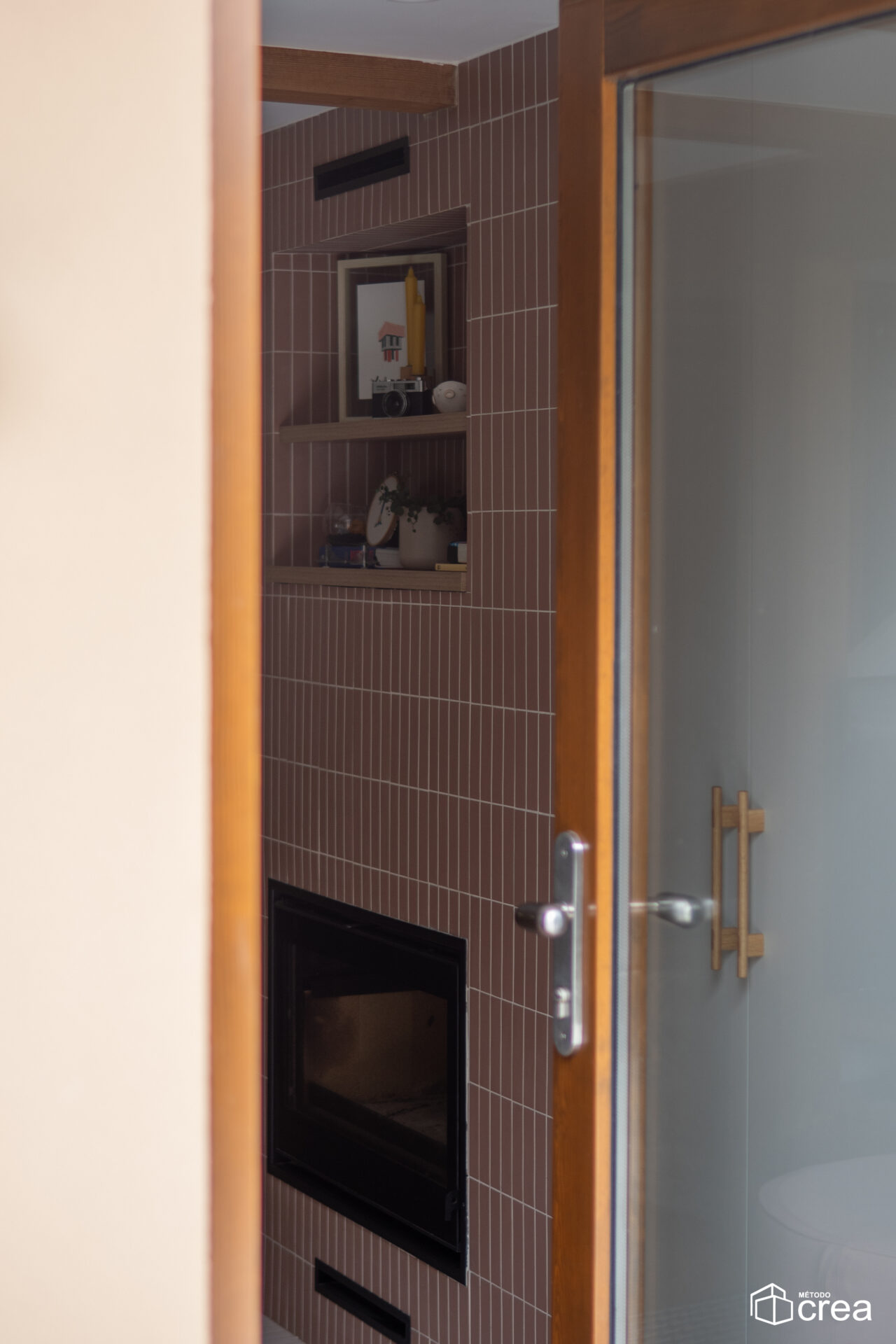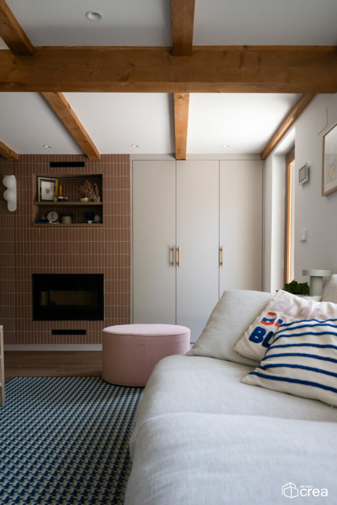 La paleta general es neutra y acogedora, con tonos cálidos, maderas naturales y una atmósfera serena que invita al confort. Destacan varios elementos clave. La chimenea protagoniza el espacio gracias a un alicatado vertical de líneas geométricas y tono rosado, aportando textura y singularidad al salón. Este mismo alicatado se traslada, en versión de color invertida, al suelo de la cocina, reforzando la conexión visual entre las dos zonas.