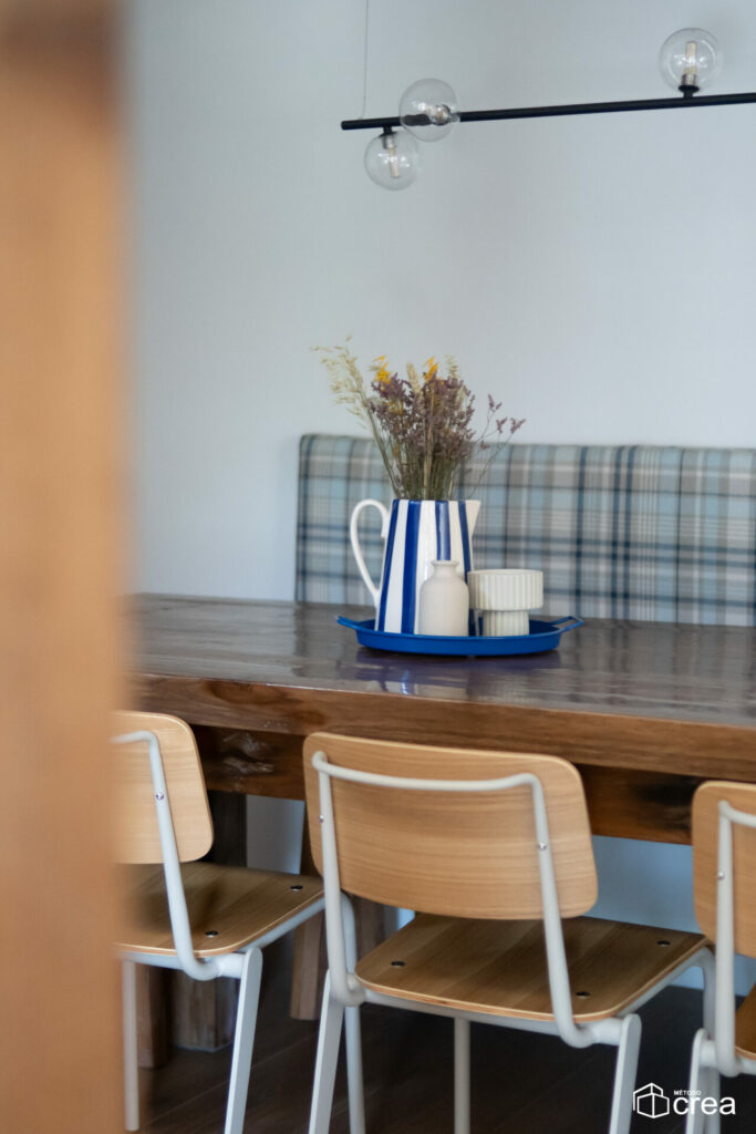 El azul intenso actúa como contrapunto cromático, salpicando textiles, taburetes y elementos decorativos, y aportando una energía fresca y contemporánea al conjunto. En la cocina, el mobiliario en madera clara y blanco mate refuerza la sensación de luminosidad, mientras que el diseño del mobiliario y la distribución garantizan la máxima funcionalidad para el día a día.
