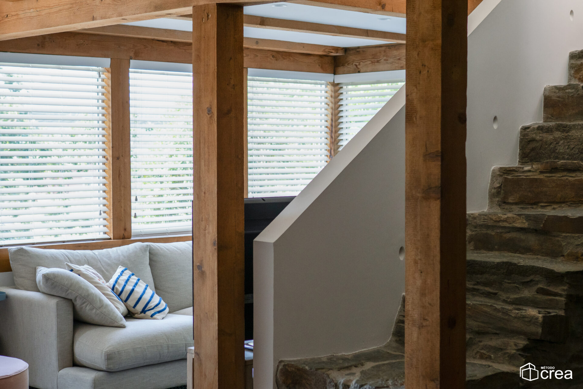 La vivienda, que originalmente fue una pequeña casa de piedra, había sido ampliada por anteriores propietarios mediante una nueva estructura de madera y la incorporación de grandes ventanales que abren el interior hacia el paisaje. Uno de los elementos más singulares del conjunto es la antigua escalera exterior de piedra, ahora integrada en el interior como conexión entre las dos plantas.