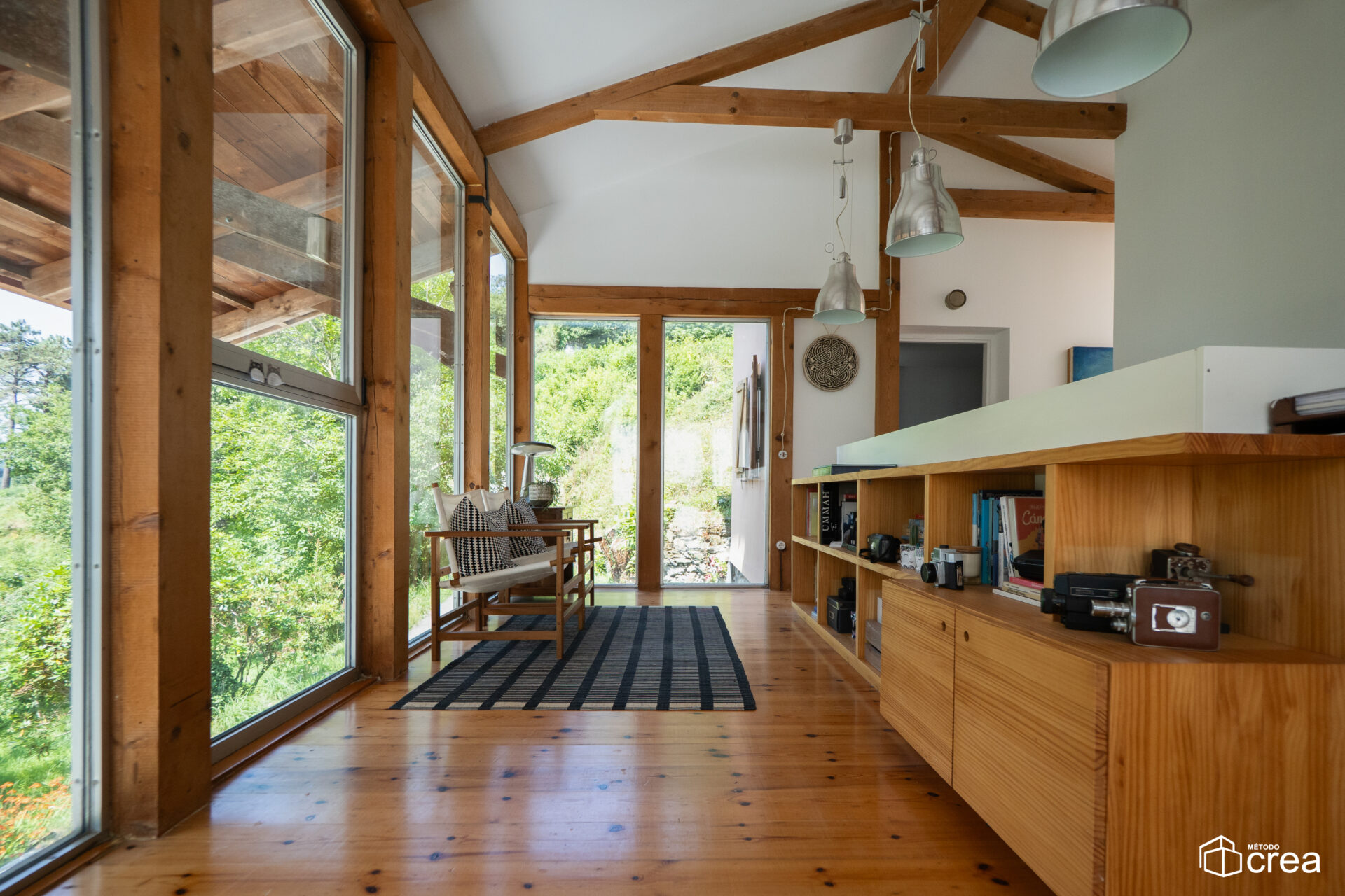 La estructura de madera vista, las vistas al entorno natural y la conexión directa con el exterior convierten esta zona en un lugar inspirador, ideal tanto para trabajar como para desconectar.