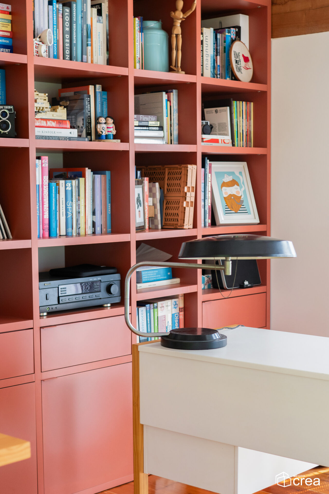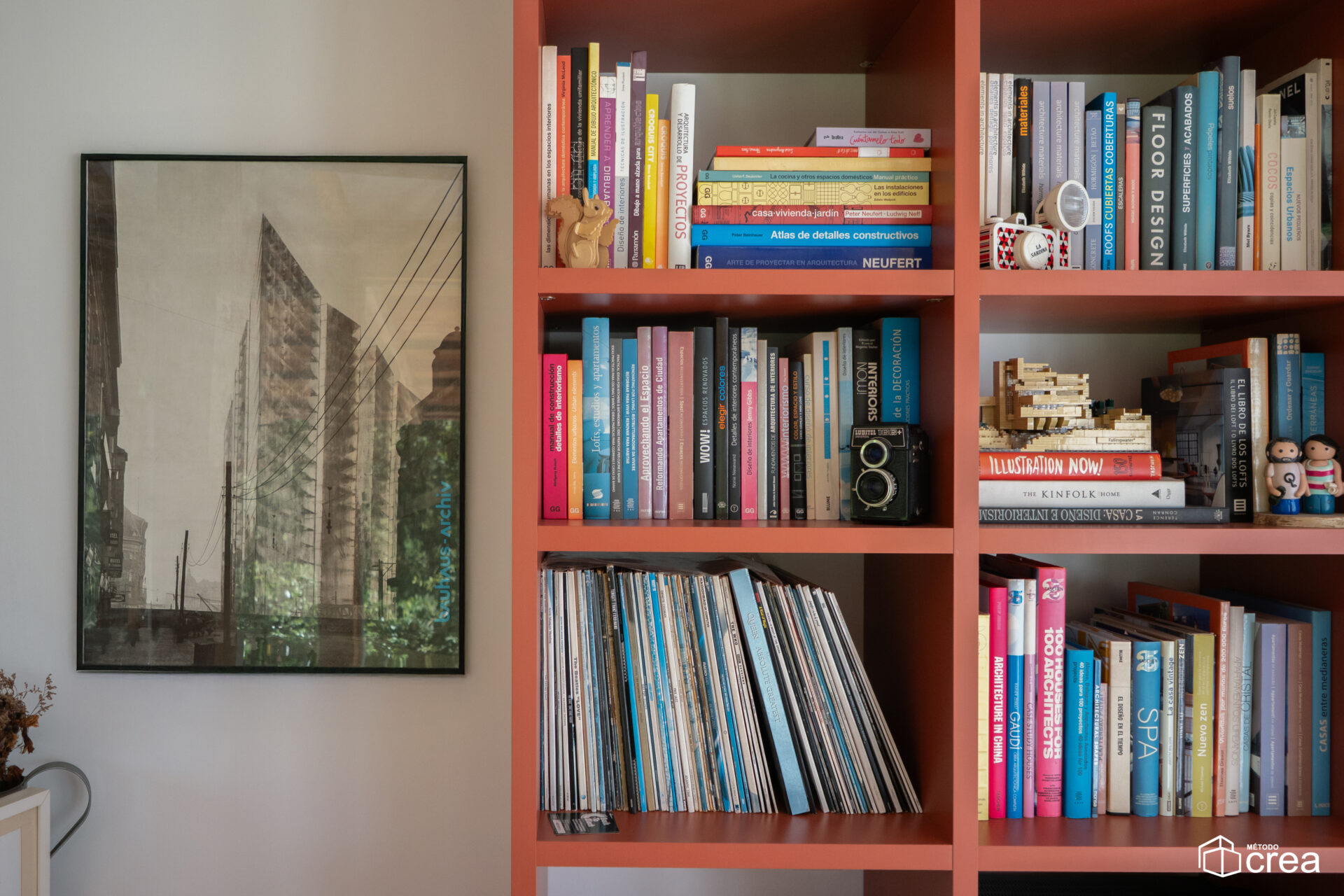 A pocos pasos, en una zona completamente abierta y bañada por la luz que entra a través del gran ventanal de la fachada principal, se encuentra el estudio. Un espacio de trabajo práctico con una mesa de escritorio orientada al paisaje y una estantería a medida que recoge libros, discos y objetos personales. El tono terracota de la librería establece un guiño cromático con los elementos cerámicos del salón y la cocina, reforzando la coherencia visual entre plantas.